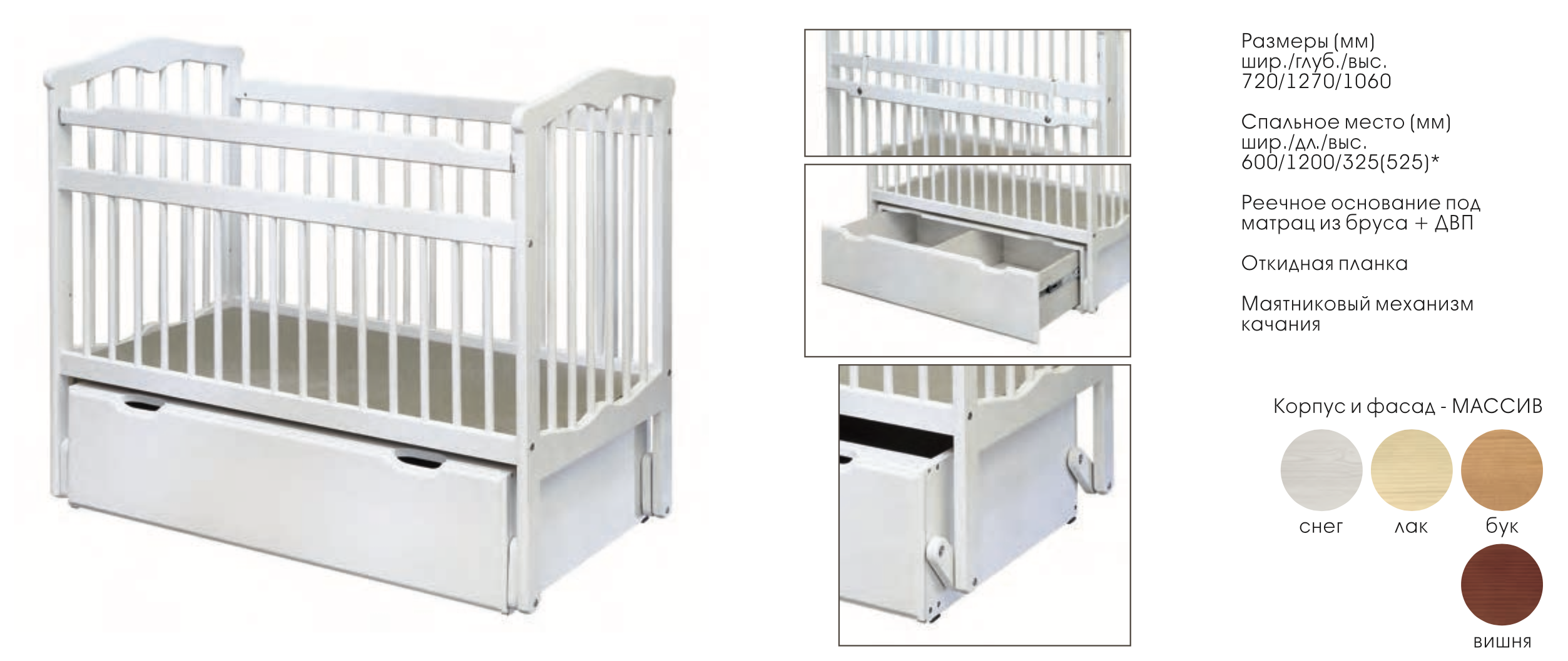 —Детская Кровать Массив с Маятником Малыш/Разные Цвета Ш-1270 х Г-720 х В-1060 мм